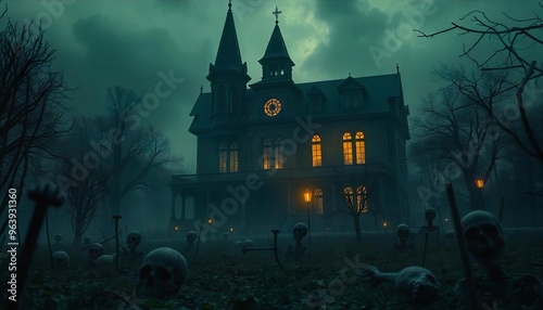 Haunted Victorian Night: A gothic Victorian mansion shrouded in eerie fog, illuminated by an unsettling glow, amidst a graveyard under a stormy sky.
