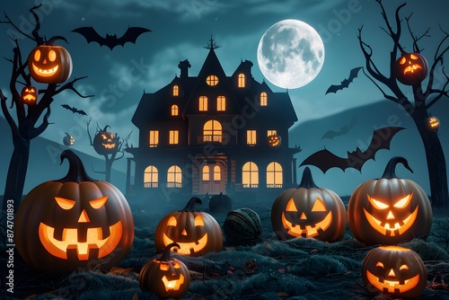 Haunting Halloween night with carved pumpkins and bats in front of a spooky house under a full moon.