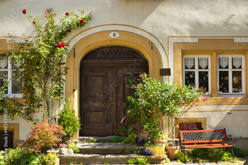door, house, architecture, entry, front, window, home, building, aged, street, piter, wall, village, forest, exterior, flower, veneer, italy, europa, travel, town, green, rustic