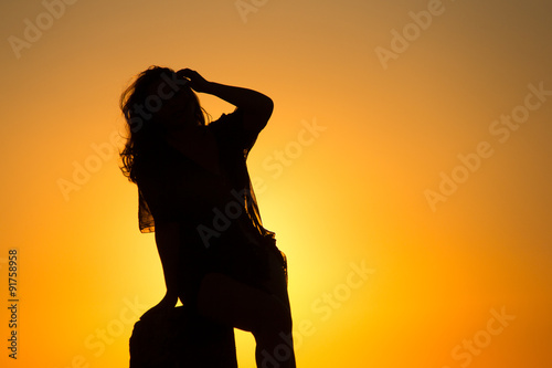 sunset, evening, quay, woman, girl, silhouette, model, horizon, sea, sun, yellow, blue, orange, angel, throw, foulard, towel, island, black, mountain, water, sky, hair, reside, 21, sculpture, princess, queen, leg, glance, way, arm, attractive, vacation, shadow, summer