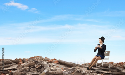 chair, cup, girl, hat, retro, beautiful, beaver, black, bowler, break, ruin, destroy, caucasian, classic, hot drink, colours, costume, cute, cylinder, elegant, fashionable, fresh, glamourous, idea, lady, model, new, outfit, pretty, refreshment, to sit