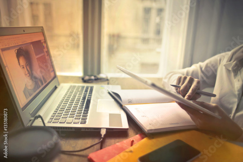 woman, girl, smile, hand, computer, technology, work, job, solution, tablet, touchpad, pad, smartphone, device, object, business, businesswoman, pen, write, search, laptop, notebook, office, window, men at work, folder, light, home, indoor, detail, phone