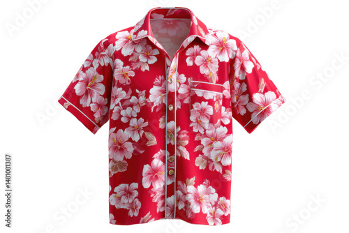 Hawaiian Shirt with Floral Print: A vibrant red short-sleeve shirt adorned with white floral patterns, a perfect blend of tropical flair and classic style for a summer vacation or a casual day out.