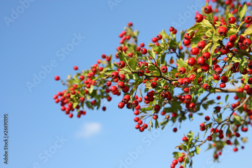 hawthorn, berry, autumn, red, plant, nature, fruit, leaf, tree branch, closeup, tree, season, outdoors, colours, food, non-urban, green, rural, ripe, bush, twig, beauty, background, crop, botany, foliage, medicative, blue, sky