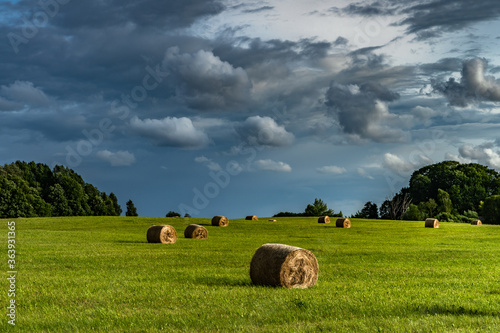field, landscape, sky, grass, hay, agriculture, nature, farm, summer, meadow, green, blue, rural, bale, country, countryside, cloud, cloud, farming, harvest, straw, tree, scenery, bale, pasture, latvia, storm, thunderstorm