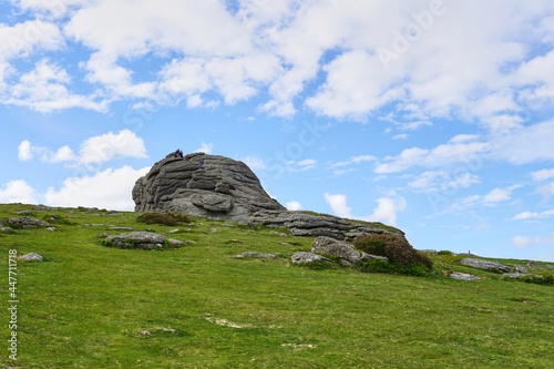 Haytor Rocks, Dartmoor's most famous landmark, is a granite tor on the eastern edge of Dartmoor in Devon, UK. sunny day.