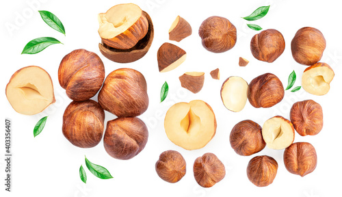 Hazelnuts isolated on white background. Top view. Flat lay.