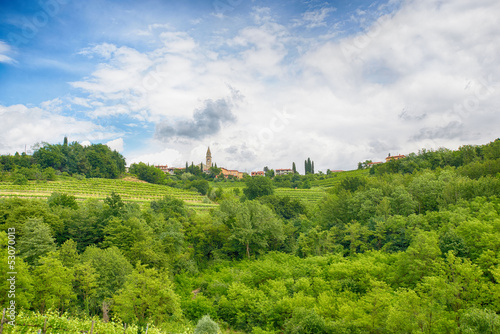 blue, country, countryside, down, slovenia, slovene, farm, farming, field, green, hill, lush, pasture, remote, rolling, rural, scene, sky, summer, tree, typical, village, church