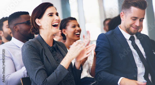 He is such a funny lecturer. Cropped shot of an attractive young businesswoman sitting with her colleagues and clapping while in the office during the day.