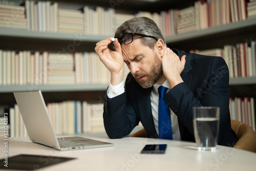 cephalalgia, medicine, man, pill, migraine, exhausted, stressful, business, problem, suffering, sleepy, depressed, frustrated, trouble, ill, sad, confident, thinking, tied-up, middle-aged, disease, hard-working, emotional, indoor, person, job, unwell, men at work, overtime, bankruptcy, male, expression, workplace, fever, photogenic, negative, goggles, interior, despair, manager, intelligent, virus, caucasian, ache, health, anxiety, entrepreneur, work, debt, bad