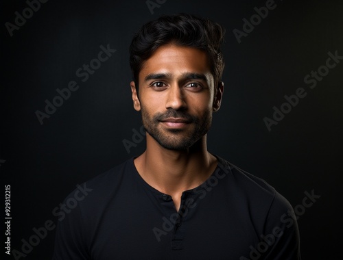 head shot, casual attire, dark background, male model, black background, smiling face, studio shot