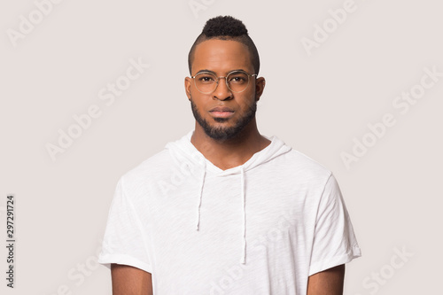 Headshot portrait of serious biracial man in glasses posing