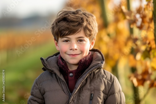 Headshot portrait photography of a glad kid male wearing a cozy winter coat against a vineyard background. With generative AI technology