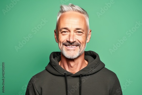 Headshot portrait photography of a satisfied mature man wearing a stylish hoodie against a pastel green background. With generative AI technology