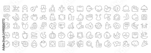 icon, icon, set, vector, outline, diet, fitness, lifestyle, health, wellness, food, exercise, nourishment, body, measure, vegetable, fruit, sport, activity, scale, heartbeat, nubes, water, meat, calendar, apple, weight, sleep, tomatoes, egg, carrot, banana, juice, pea, pea, broccoli, cherry, avocado, strength, liver, hourglass, treadmill, pill, chart, box, bottle, potato, gauge, salad