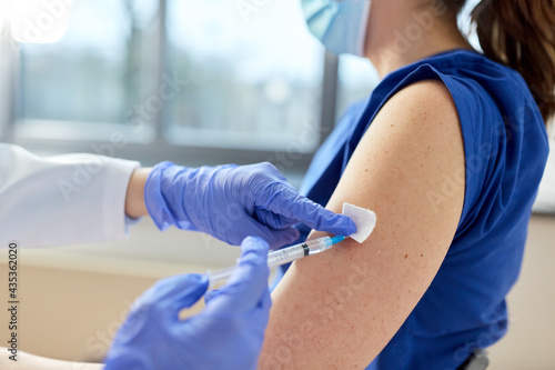 health, medicine and pandemic concept - female doctor or nurse wearing protective mask with syringe vaccinating medical worker hospital