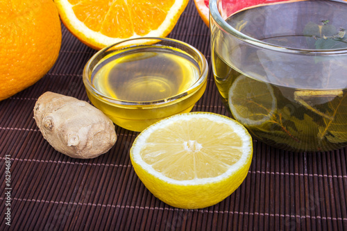 health, traditional medicine, folk remedy and ethnoscience concept - cup of herbal tea, honey, ginger, orange and grapefruit