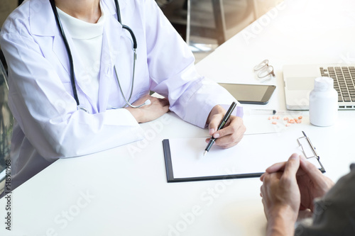 Healthcare and Medical concept, patient listening intently to a female doctor explaining patient symptoms or asking a question as they discuss paperwork together in a consultation