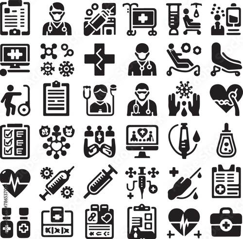icon, vector, set, symbol, icon, signs, black, web, illustration, computer, pictogram, medicals, business, cyberspace, travel, medicine, hotel, science, silhouette, diagnosis, doctor, hygiene, disease, injury, location, mask, patient, cost, health care, treatment, prevention, report, collection, white background, hospital