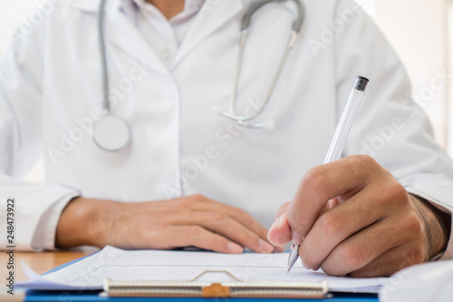 Healthcare medical Expenses concept, Hands Doctor's writing and working on prescription clipboard with record information paper folders on desk in hospital or clinic. Selective focus