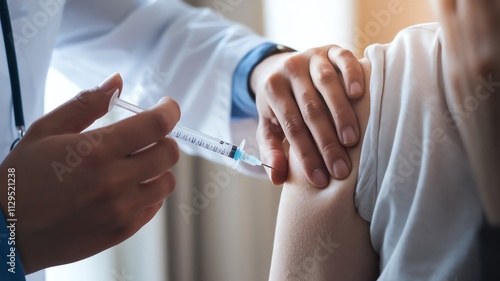 Healthcare professional administering vaccine in clinical setting, emphasizing immunization.