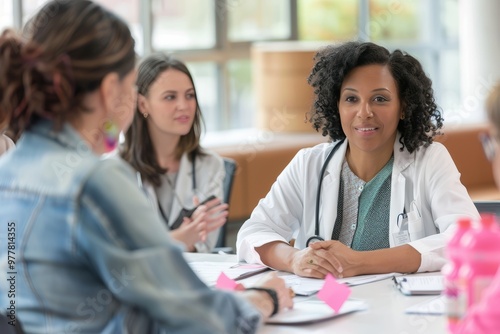 Healthcare Professional Leading a Collaborative Discussion on Breast Cancer Prevention in a Bright Conference Room