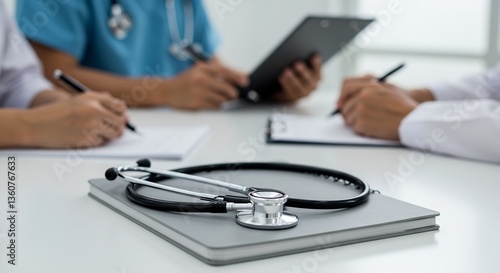 Healthcare Professionals Collaborating on Patient Charts, Medical Stethoscope on Notebook, Doctor's Office, Teamwork, Medical Consultation, Diagnosis, Treatment Plan