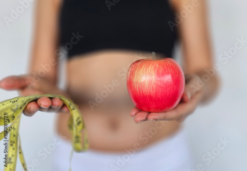 Health-focused individual holding a red apple and measuring tape, promoting fitness