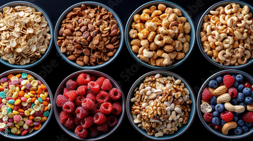 Healthy and colorful breakfast selection featuring various nuts, berries, and cereals. vibrant display of nutritious options for balanced meal