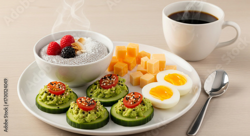 Healthy and Delicious Breakfast Plate: Chia Seed Pudding, Avocado Cucumber Bites, Hard-Boiled Eggs, and Cheese with Coffee.