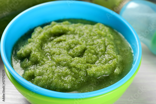 Healthy baby food. Bowl with tasty broccoli puree on white table, closeup