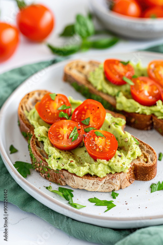 healthy bread, A beautifully arranged plate featuring toasted slices of vegan protein bread topped with avocado mash and cherry tomatoes. The background includes a vibrant green