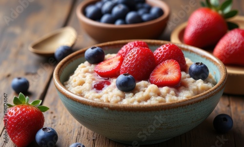 oatmeal, breakfast, health food, berry, strawberry, blueberry, wooden table, alimentary, comfort food, bowl, colourful, red, blue, natural, wholesome, food photography, morning meal, satisfying, delicious, meal, cereal, natural light, rustic, fresh, vibrant, vegetarian, tempting, garnish, homemade, simple, tasty, sweet, adult, wellness, healthy lifestyle, nourishment, sustainable, grain, snack, eating, dish