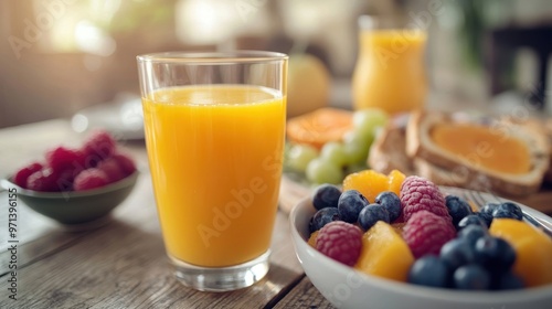 Healthy Breakfast Concept with Freshly Squeezed Orange Juice, Mixed Fruit, and Whole-Grain Toast on Table