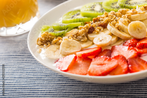 Healthy breakfast served with plate of yogurt muesli kiwi strawberries and banana