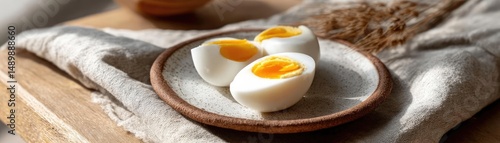Healthy breakfast with minimal rustic style in kitchen concept. Delicious soft-boiled eggs served on a rustic wooden table.