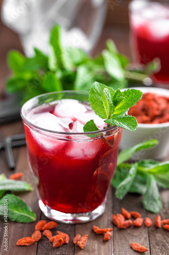 Healthy detox drink with goji berries infused in water with ice, cold refreshing beverage