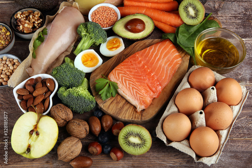 healthy eating and diet concept, natural rich in protein food on rustic table