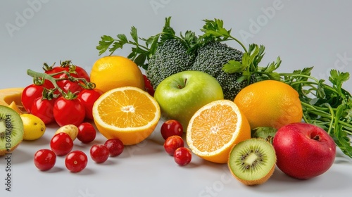 Healthy eating concept, fresh fruit and vegetables arranged symmetrically.