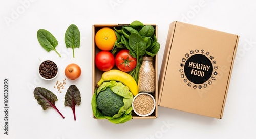 Healthy food delivery box with fresh organic vegetables, fruits, and grains for wellness. Top view of a meal kit subscription on white background.