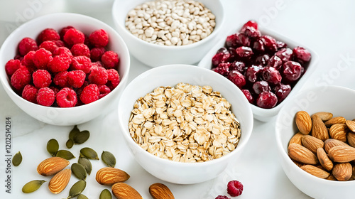 Healthy food ingredients in white bowls with nuts and berries on a marble background