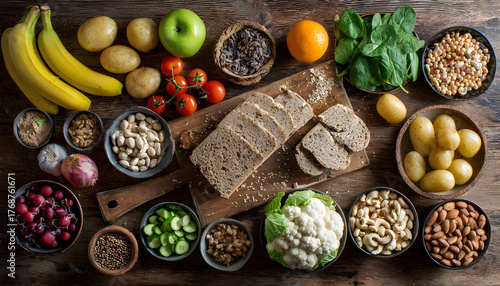 Healthy food. Selection of good carbohydrate sources, high fiber rich food. Low glycemic index diet. Fresh vegetables, fruits, cereals, legumes, nuts, greens