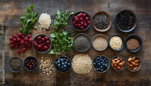 raspberry, blueberry, almond, oat, rice, arugula, barley, cranberry, grain, healthy, food, diet, nourishment, ingredient, bowl, wooden, surface, table, background, texture, organic, natural, breakfast, meal, snack, delicious, vitamin, mineral, energy, fresh, tasty, colourful, vibrant, epicure, cookery