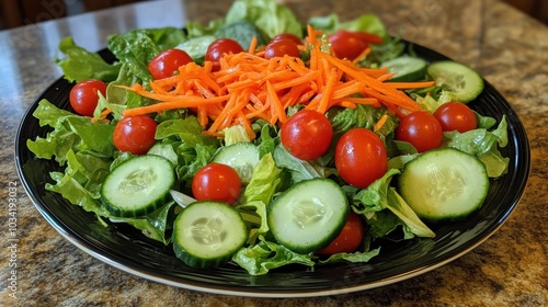 Healthy garden salad featuring mixed greens, juicy cherry tomatoes, cucumbers, and shredded carrots, fresh and colorful