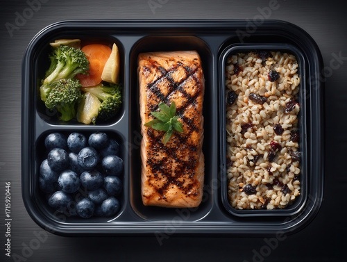 Healthy grilled salmon and vegetable meal with brown rice and blueberries served in a meal prep container