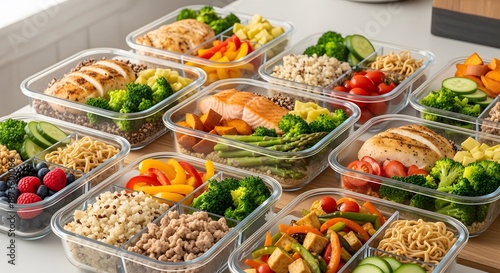 meal, healthy, food, nourishment, diet, glasses, container, chicken, salmon, vegetable, broccoli, pepper, berry, fruit, planning, lifestyle, wellness, fitness, protein, balanced, cooking, storage, recyclable, environmentally friendly, fresh, lunch, dinner, snack, organic, homemade, menu, culinary, ingredient, weight, loss, clean, eating, wooden, table, background, colourful, variety, portion, control, ready, prepared, kitchen