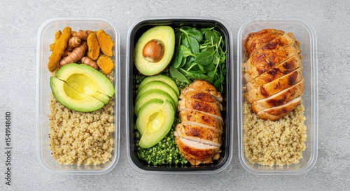 Healthy Meal Prep with Grilled Chicken, Quinoa, Fresh Vegetables, and Avocado in Containers for Balanced Diet