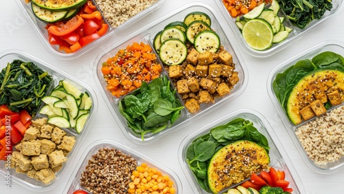 Healthy plant-based meal prep overhead flat-lay, bright and clean
