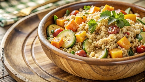 Healthy quinoa salad with roasted vegetables in wooden bowl for a nutritious meal
