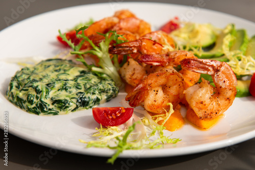 Healthy shrimp dish. Delicious grilled shrimps with avocado and salad on a white plate. Food decorated with cherry tomatoes. Sunlight. Closeup.